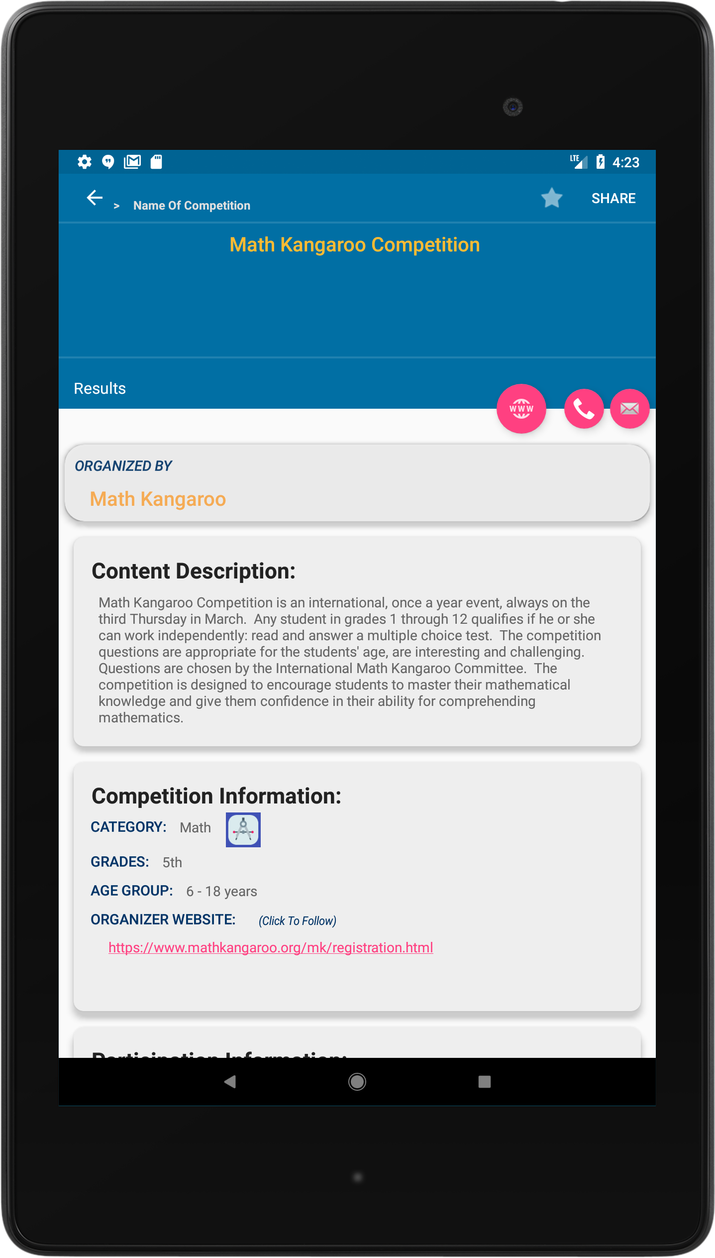 Get matched with contests based on the criteria you specify, such as grade range (K-12), register-by date, and its hosted location or zone. Also opt to display only relevant contests based on your own profile!